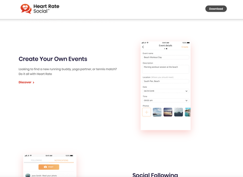 Web design for Heart Rate Social. A healthy lifestyle app for friends, dating, fitness, and events.